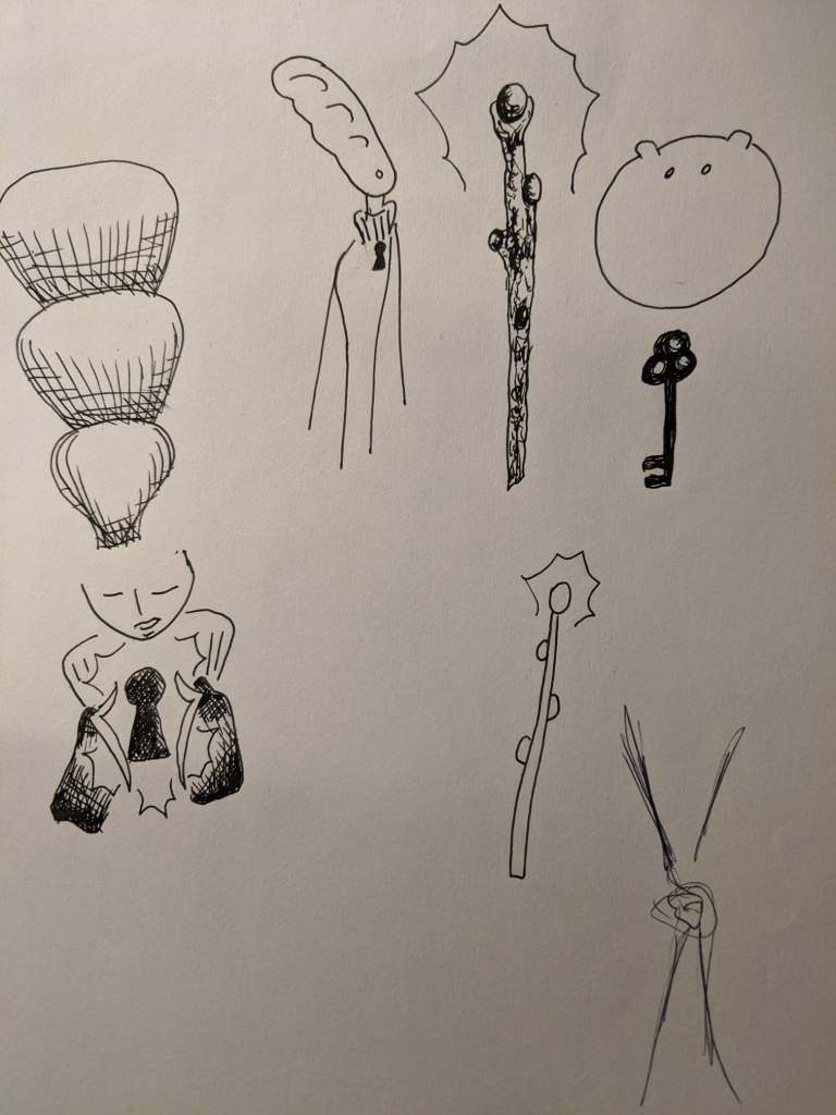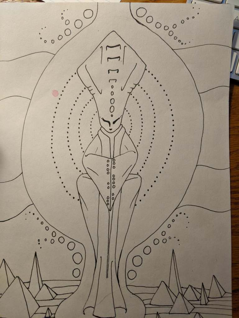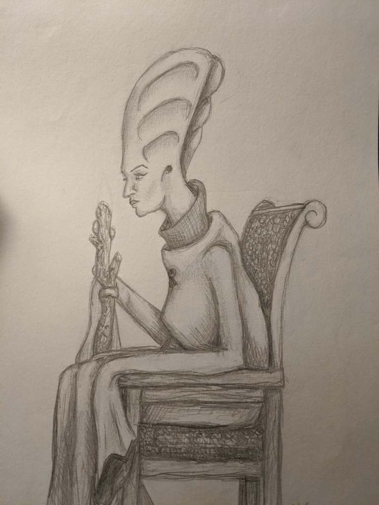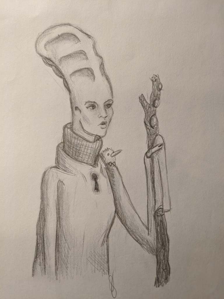The Tillers are tall, slender, and have long limbs and heads that resemble thick shark fins with gills, or even a succulent plant. All things Lodian are primarily plant or sea creature – based, as you will begin to see more and more. I created the character design based on the way my wife tied up her curtains. One day, it just looked like something, and I sketched the first idea of a Tiller. With a flowing train of robe hanging down to the ground, a meditating Tiller floats in a cross-legged position, with their arms folded in front and covered by the sleeves. They have keyholes in their chests, for which each Claviger (that post is to come) has a key that fits. They have walking staffs that have magical pearls that enhance their manifestation, and often keep pomi birds as companions.