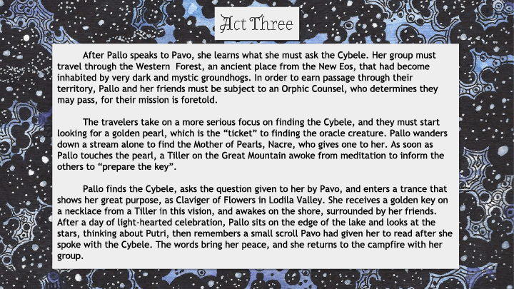 So I have been working on streamlining Pallo’s origin story this semester, making sure to incorporate my personal goals into every project, and my Writing for Visual Media course final was a script treatment for a movie. That one project really helped me figure out how to choose which elements to include in Pallo’s part of the Lodila Valley/Land of Lo series.
